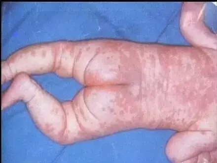 表現(xiàn)為皮膚潮紅,小斑丘疹上溢出淡黃色脂性液體覆蓋在皮疹上,以后結(jié)成較厚的黃色痂皮,不易除去,以頭頂及眉際、鼻旁、耳后多見,但是癢感不太明顯。