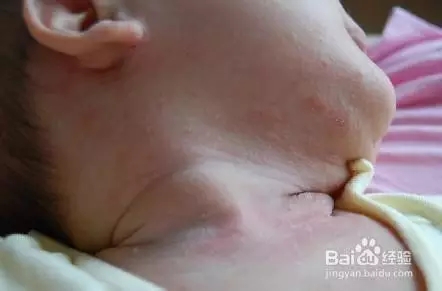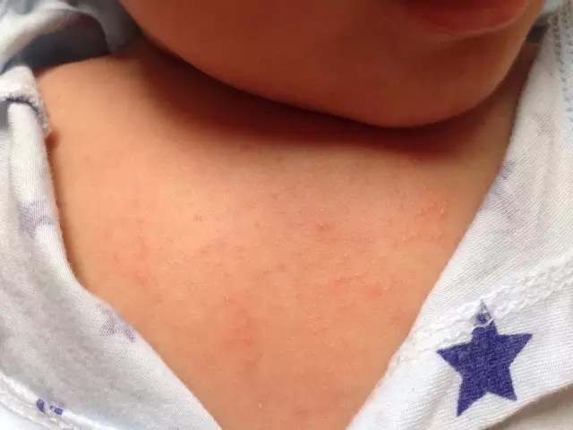 這張圖里寶寶脖子上的熱疹已開始連成一片,盡管如此但還是能看出有粒粒小疹子存在,這種情況在1歲內(nèi)的嬰兒里面比較常見,民間習(xí)慣把這叫“淹脖子”。